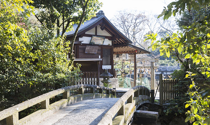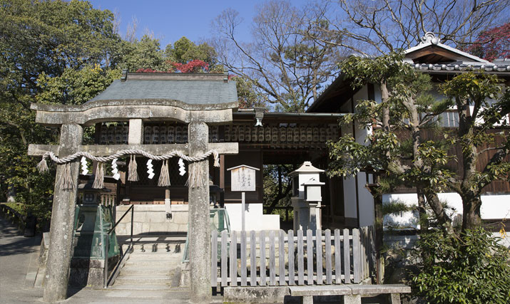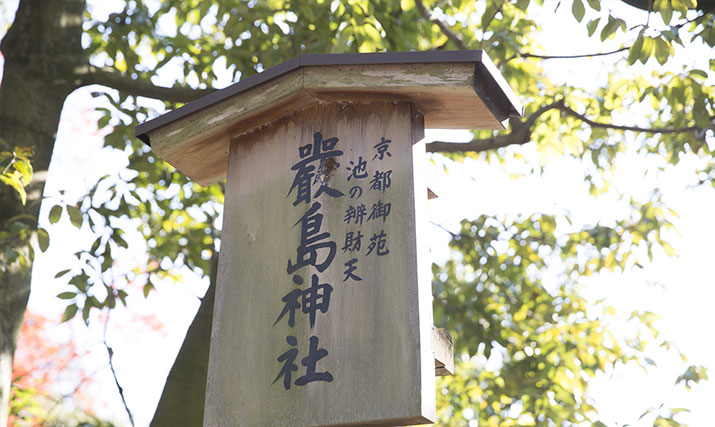 池と傍らの拾翠亭はもと九條家のもので、この社は同家の鎮守社だった。社前の石鳥居は笠木が唐破風で京都三珍鳥居の一つで池の弁財天とも呼ばれております。