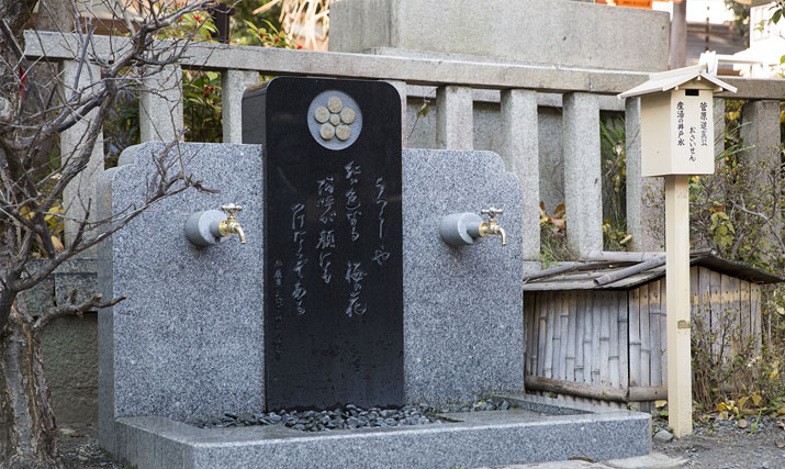 菅原道真が初湯に用いたという「初湯の井戸」深さ8-9m、現在は地下25mから湧水している。境内北東の位置にある井戸は道真公が誕生時(承和12年・西暦845年)にお使いになられた井戸です。この井戸はその当時(平安時代)のままに残り、現在に至っており、使用されている周囲の石もこの時代のものです。今日(こんにち)まで約170年が経過いたしております。この水はミネラル分が多く、大変まろやかで勉学に励まれる皆様にはこの水をお飲みいただき受験の時や病気の時に御利益をお受けください。水はご自由にお持ち帰りいただけます。